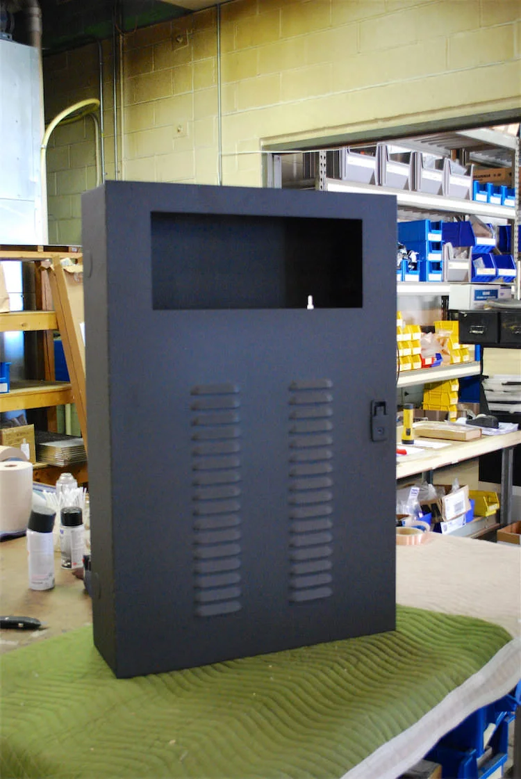 Hopewell Precision has supplied to the NBA ( National Basket Ball Assoc.) a custom wall mount steel enclosure. The unit has a hinged lockable door w/ swivel monitor mount brkts as well has front door viewing openings for viewing while the door is closed. These units were sent to over 40 Stadiums around the country..........